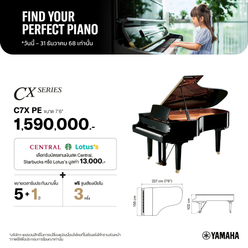 แกรนด์เปียโน Yamaha C7X ซีรีส์ที่ได้รับความนิยมนี้ตอบโจทย์อารมณ์ศิลปินของผู้เล่นที่มีความหลงใหลในดนตรีจากทั่วทุกมุมโลกและทุกยุคทุกสมัย โทนเสียงที่ได้รับการปรับปรุงใหม่และความรู้สึกในการแสดงออกที่ได้รับการสืบทอดมาจากรุ่น CFX ที่จะเปลี่ยนพื้นที่ธรรมดาทั่วไปให้กลายเป็นโถงแสดงคอนเสิร์ต
