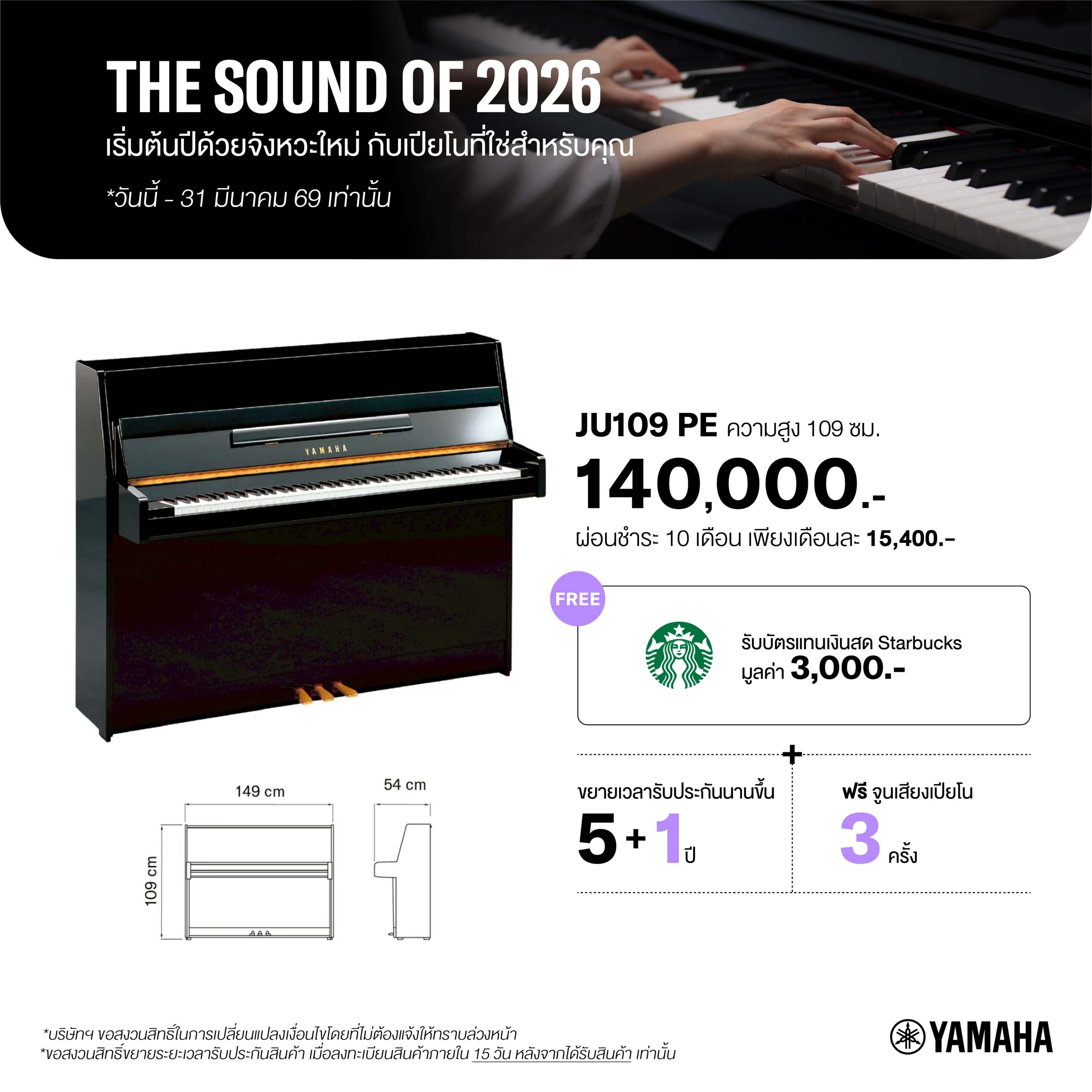 อัพไรท์เปียโน Yamaha JU109 รุ่นความสูง 109 ซม. รุ่นที่เล็กที่สุดในซีรีส์ด้วยความสูงเพียง 109 ซม. ที่มุ่งเน้นที่ความเล็กกะทัดรัด แต่คงไว้ซึ่งความสวยงามร่วมกับเทคโนโลยีและฝีมือการผลิตของ Yamaha