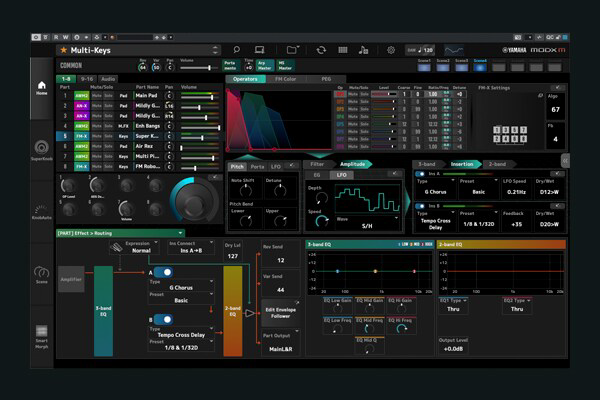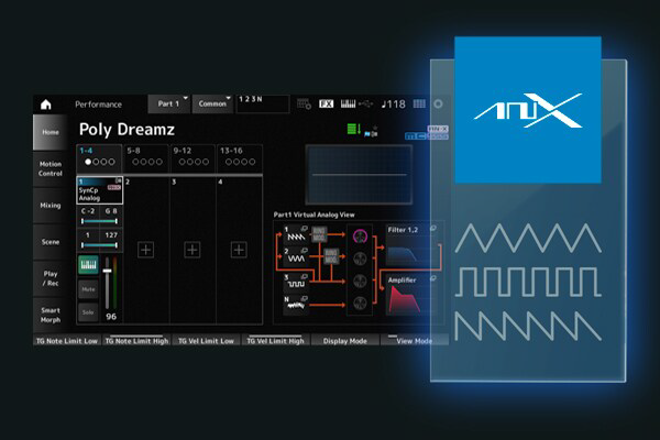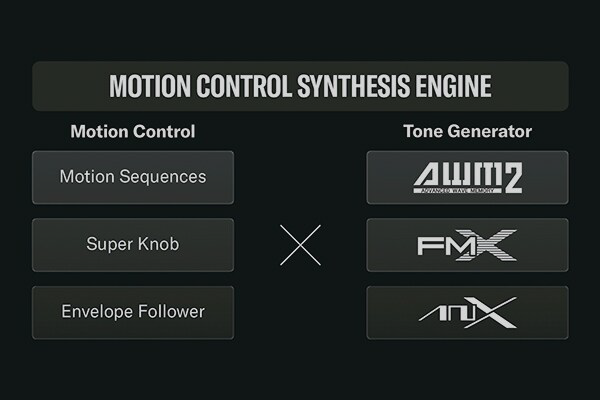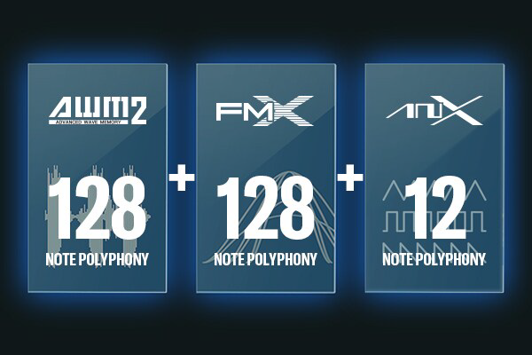 Motion Control Synthesis Engine AMW2: 128 Elements (max.), FM-X: 8 Operators, 88 Algorithms, AN-X: 3 Oscillators, 1 Noise |
